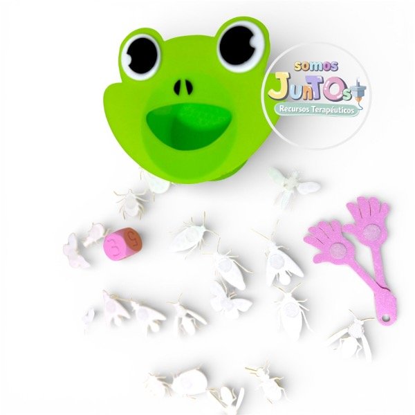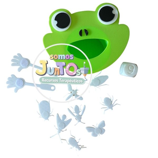 Manitos con velcro que atrapan insectos, un zapito que espera su comida y un dado que invita a contar, reconocer cantidades y coordinar movimientos 🎲🖐️